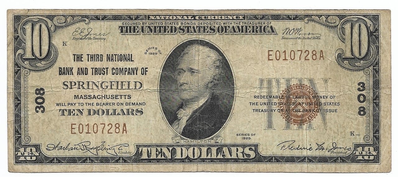 National Bank Note: Springfield, Massachusetts - $10 Series of 1929 Type 1. Charter 308, The Third National Bank and Trust Company, Springfield, Massachusetts. S/N: E010728A, pp K189/202. Fine.