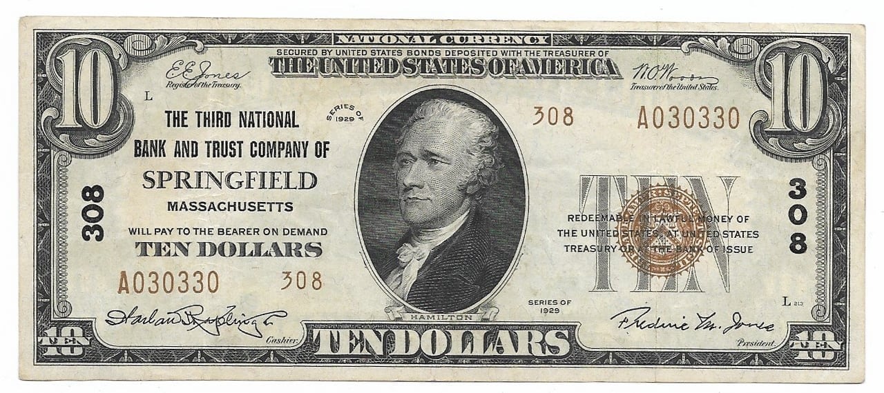 National Bank Note: Springfield, Massachusetts - $10 Series of 1929 Type 2. Charter 308, The Third National Bank and Trust Company of Springfield, Massachusetts. S/N: A030330, pp L213/203. Nice Very Fine.