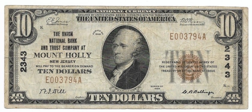 National Bank Note: Mount Holly, New Jersey - $10 Series of 1929 Type 1. Charter 2343, The Union National Bank and Trust Company of Hoboken, New Jersey. S/N: E003794A, pp K128/206. Very Fine.