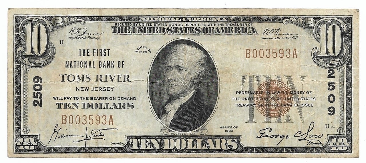 National Bank Note: Toms River, New Jersey - $10 Series of 1929 Type 1. Charter 2509, The First National Bank of Toms River, New Jersey. S/N: B003593A, pp H104/93. About VF.