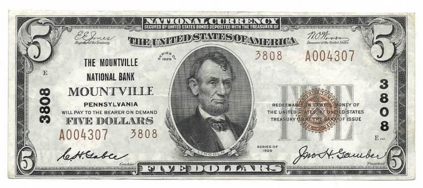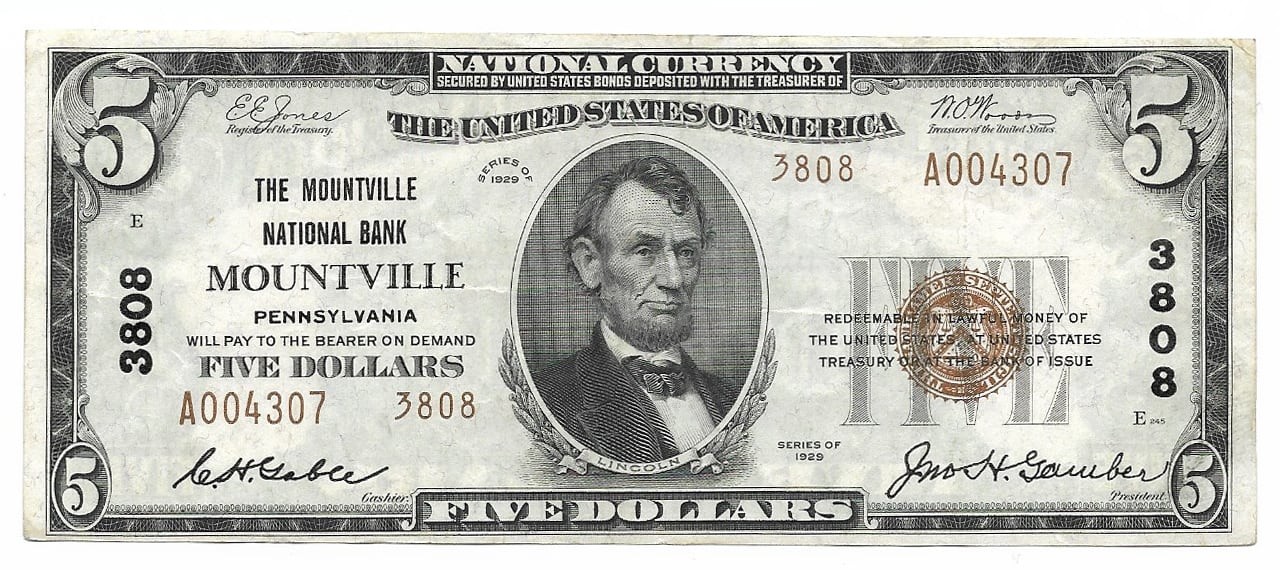 National Bank Note: Mountville, Pennsylvania - $5 Series of 1929 Type 2. Charter 3808, The Mountville National Bank, Mountville, Pennsylvania. S/N: A004307, pp E245/364. Choice VF, bright paper and with the appearance of an EF or better note.