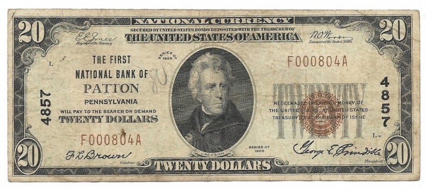 National Bank Note: Patton, Pennsylvania - $20 Series of 1929 Type 1. Charter 4857, The First National Bank of Patton, Pennsylvania. S/N: F000804A, pp L50/69. Fine, minor pencil notation.