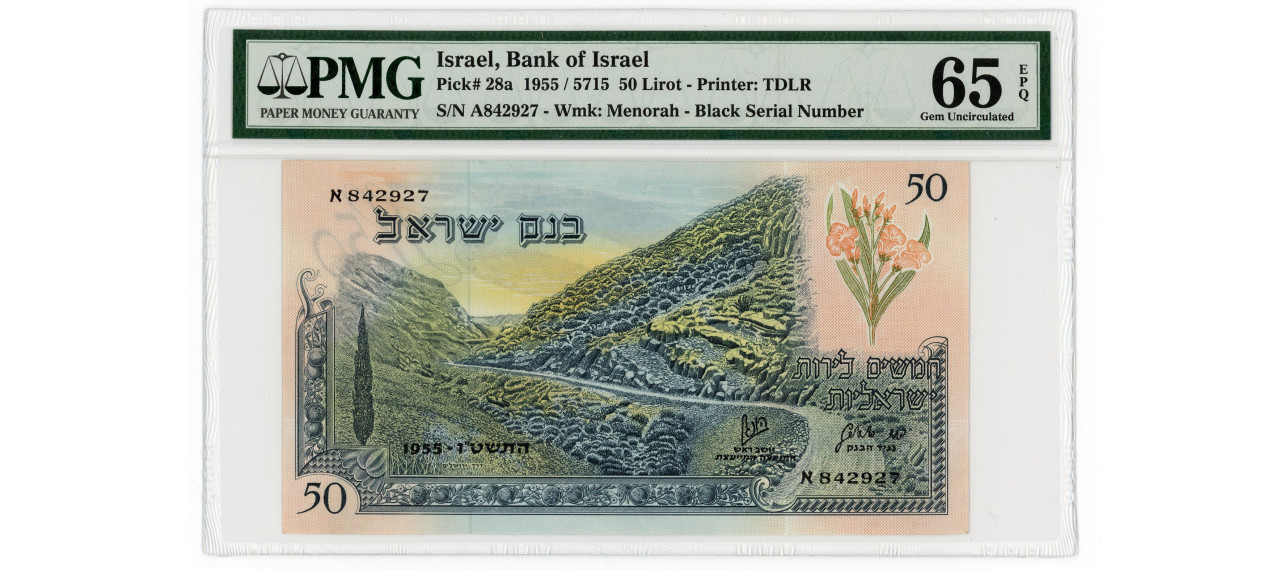 Israel – Bank of Israel 50 Lirot, 1955/5715, Pick 28a, PMG Gem Uncirculated 65 EPQ